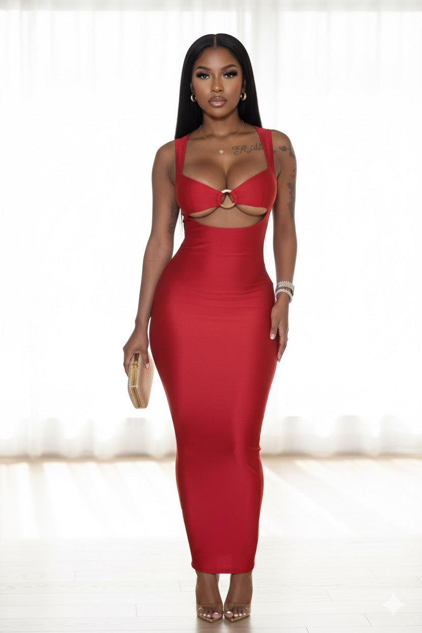Unleash your inner siren with the Crimson Allure Maxi Dress. This striking red gown features a sleek, body-hugging silhouette that gracefully flows to the floor, accentuating every curve. Its daring design is highlighted by a tasteful cut-out detail at the bust with a subtle metallic ring accent, adding a touch of audacious glamour. The back boasts an elegant open design, held together by delicate straps and a chic gold ring, ensuring all eyes are on you as you make your entrance and exit. Perfect for evenings out, special events, or when you simply want to command attention with sophisticated confidence.